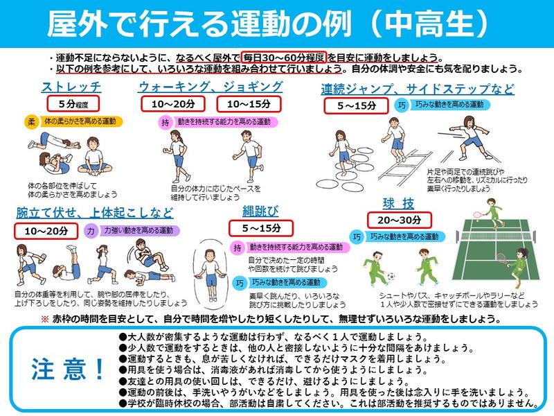 いわき市教育委員会より、「手軽にできる運動例」「ホームページでの運動紹介」の紹介がありましたので、お知らせいたします。体力低下を防いだり健康を維持したりするため、積極的に体を動かしてほしいと思います。