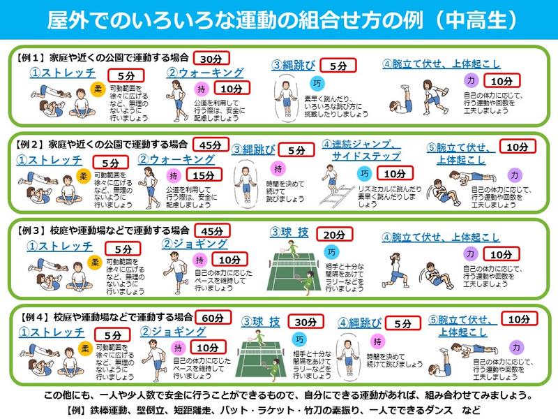 ・学校から出た課題に取り組むとともに、メールやホームページでお知らせしている「学習コンテテンツ」等を有効に使って学習を進めてください。また、適度に体を動かし、体力が落ちないように努めてください。