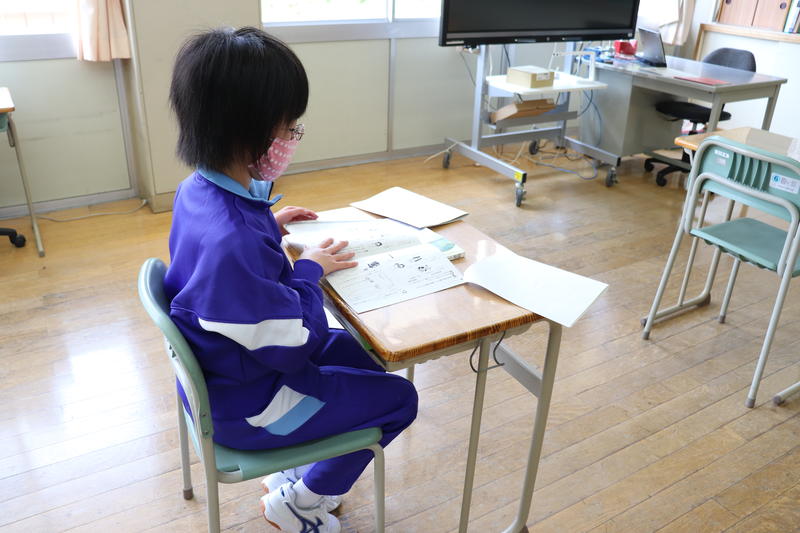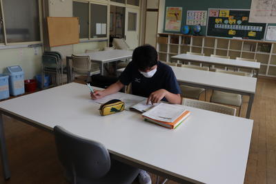 昨日より始まりました分散登校ですが、本日は1年生が1名登校しました。登校後の検温を済ませ、教室で課題に取り組みました。予習に当たる部分が多いですが、教科書をよく読んで課題に取り組み、理解を深めていました。