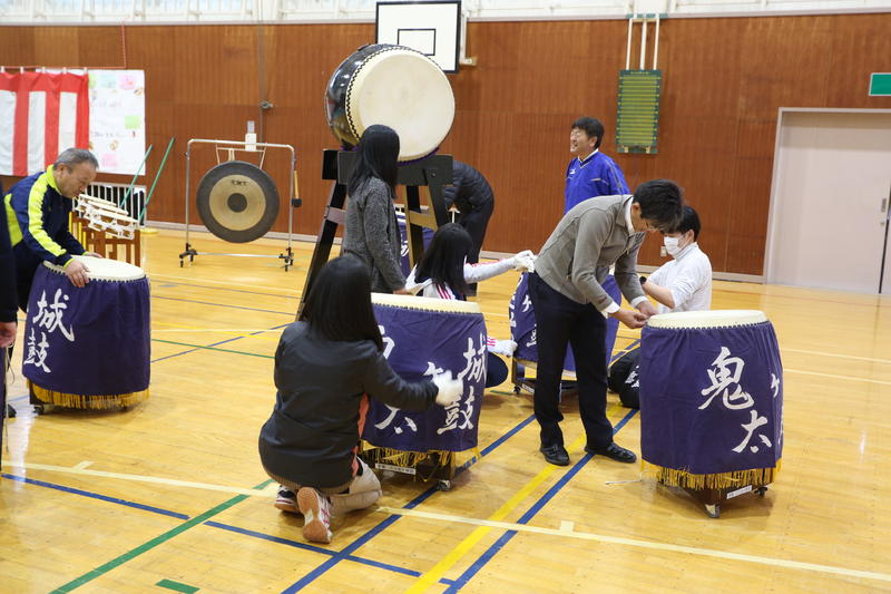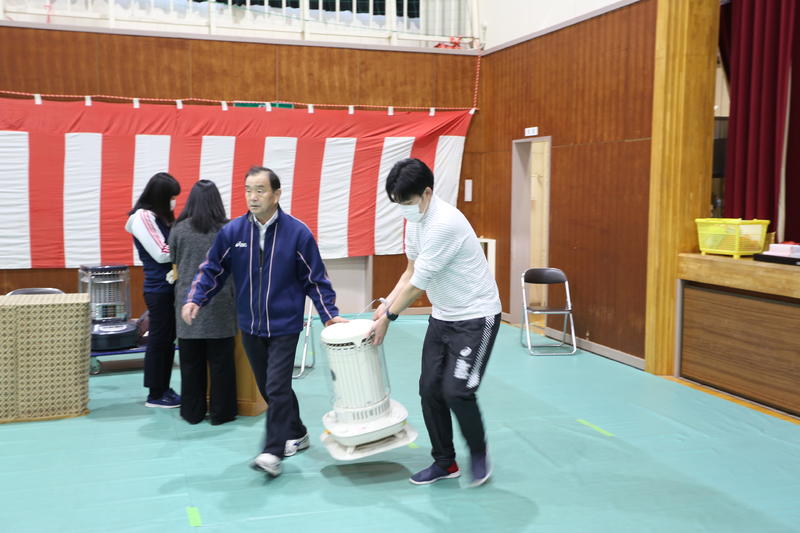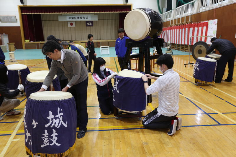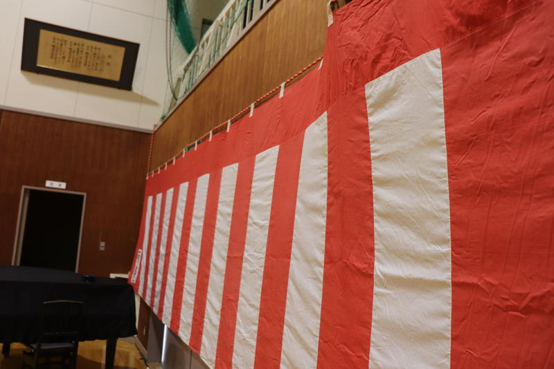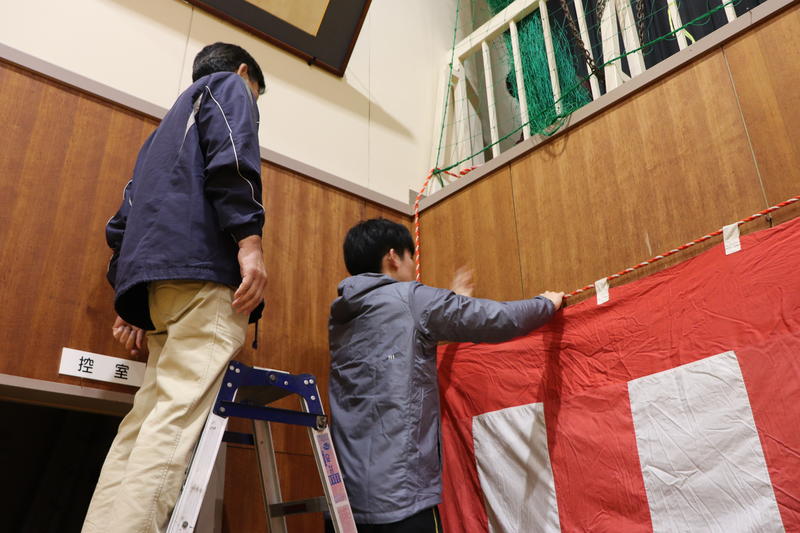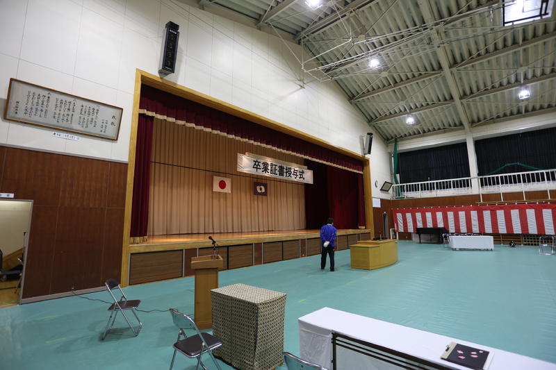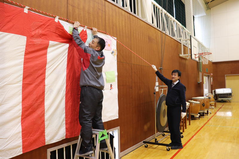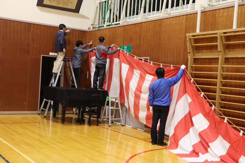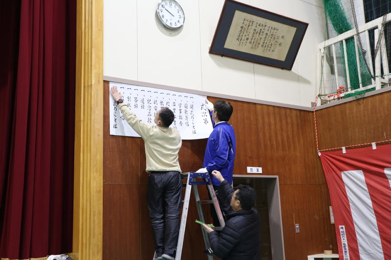 桶売中学校では、卒業式へ向けて準備を進めています。来賓の皆様をご招待できなくなってしまいましたが、式場は桶売小中学校の正式なもので祝福したいと考えております。今日は、会場に紅白幕を設置しました。