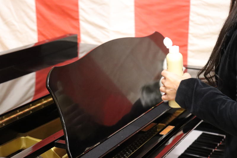 一見綺麗に見えるピアノの表面も、雑巾で拭いてみるとかなり汚れが出てきました。ツヤ出し剤を使って表面を綺麗にします!