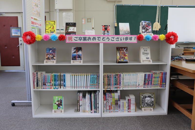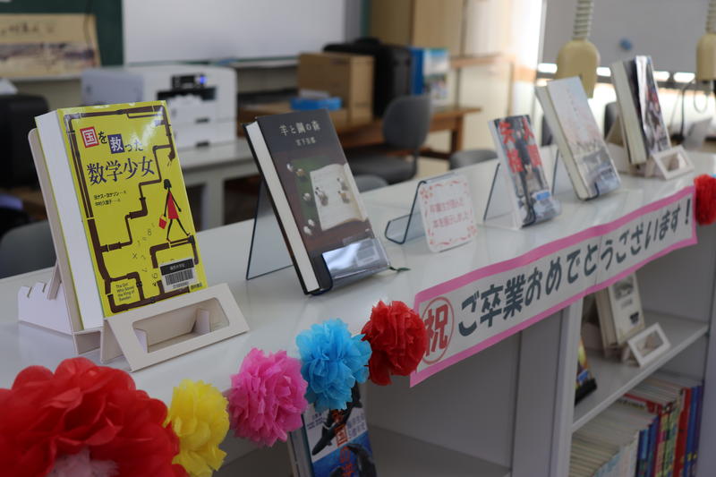 生徒の皆さんが読んでいた本を並べました!とのことです。校内も徐々に卒業式バージョンへと変化しています。