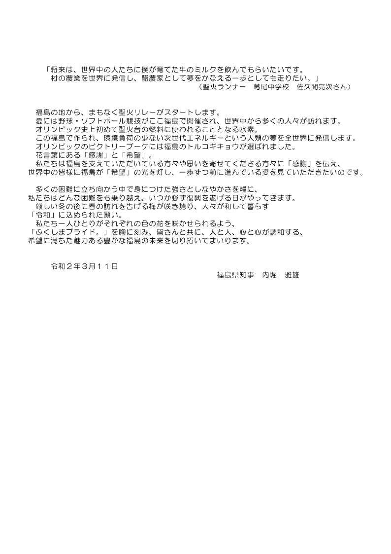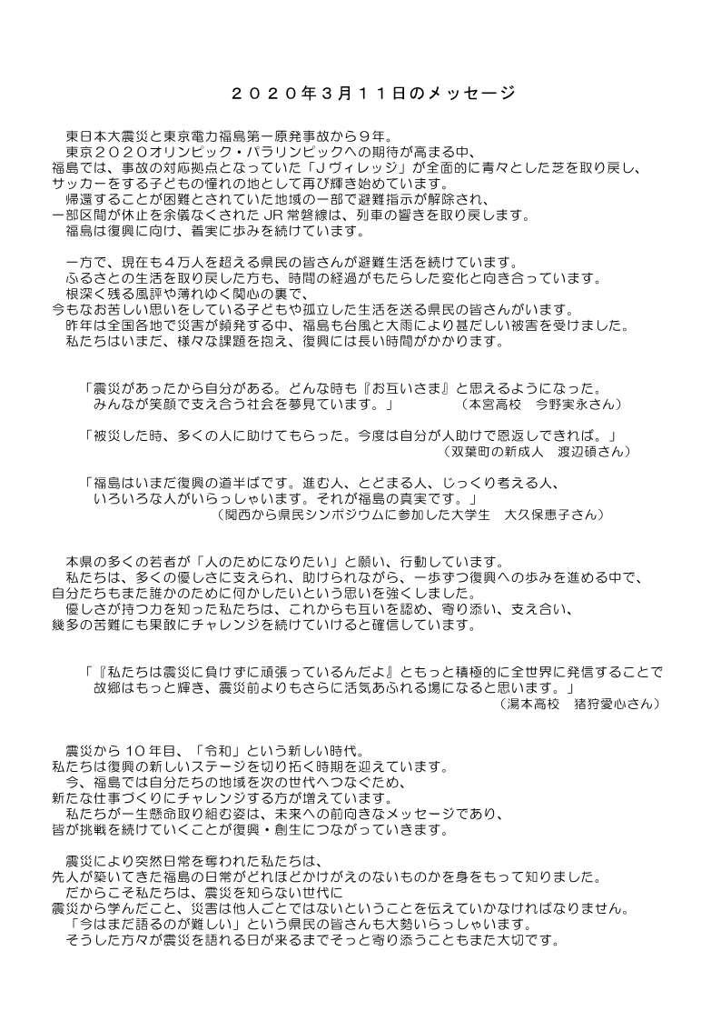 昨日、3月11日で震災から9年が経ちました。「3.11ふくしま追悼復興祈念行事」での福島県知事からのメッセージが届きました。生徒の皆さんには明日配付しますが、生徒の皆さんにも、保護者の皆様、また地域の皆様にも、是非ともご一読いただきたい内容です。