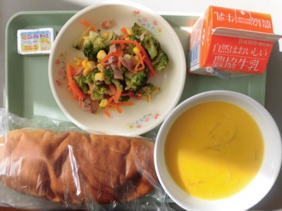 今日は、黒糖パン、牛乳、ブロッコリーソテー、かぼちゃポタージュ、