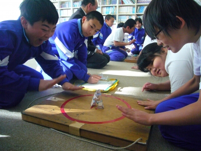 司会は高学年のTくん、さすがです。進行がスムーズ。それぞれの学年にも役割がありますが、しっかりと行うことができました。子どもたちは、それぞれ力士さながらの『部屋』に分かれて、部屋ごとのリーグ戦に挑みました。紙相撲は、ここ桶売で何十年も続く伝統の行事で、大盛り上がりでした。