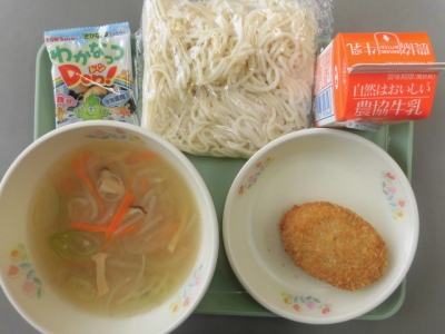今日は、みそかけうどん、枝豆コロッケ、わかナッツドン、牛乳