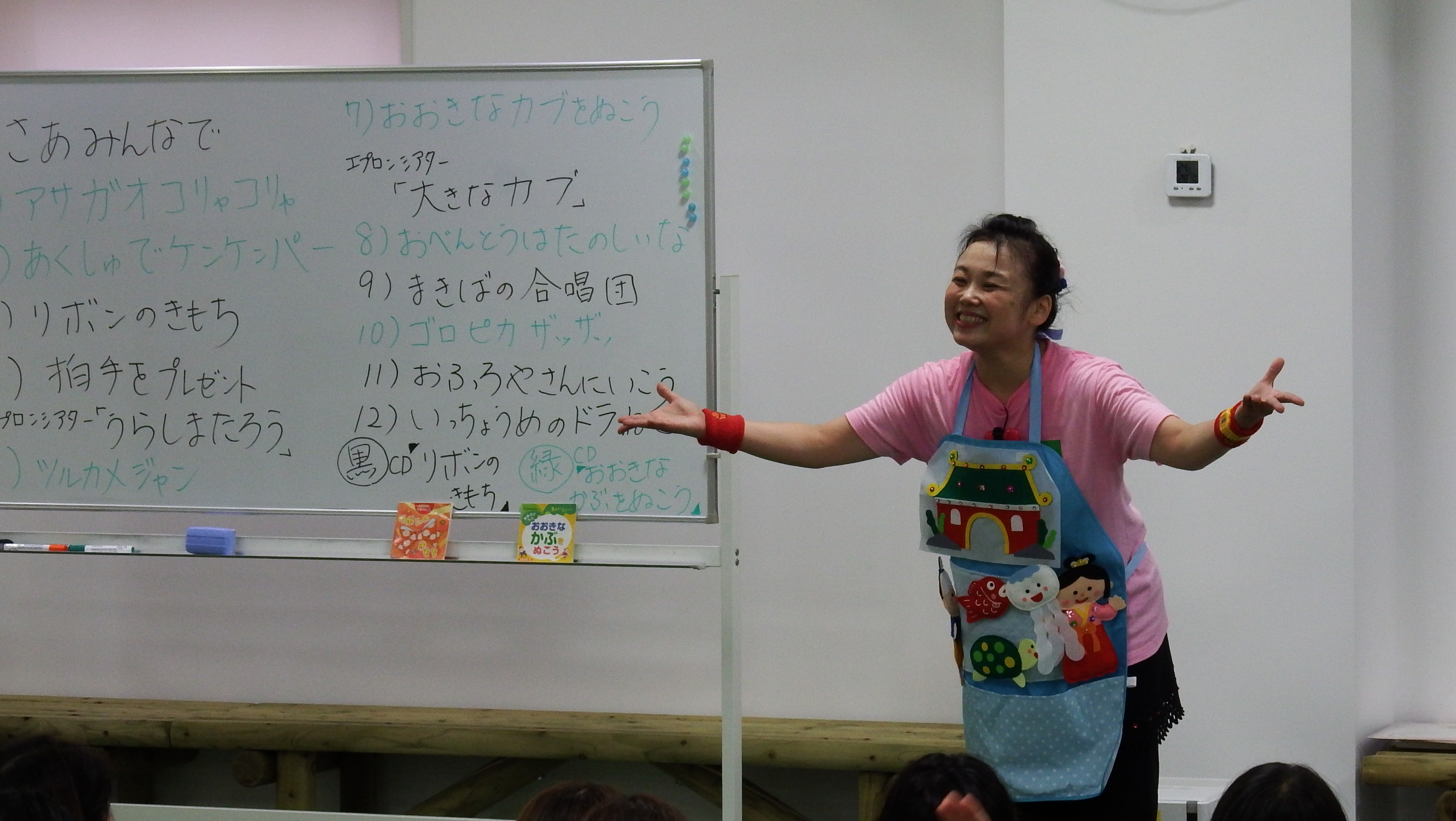 7月30日(月)に乳幼児教育研究所 内田 順子先生においできただき、「園児がよろこぶ 手遊び・エプロンシアター」というテーマで、お話していただきました。