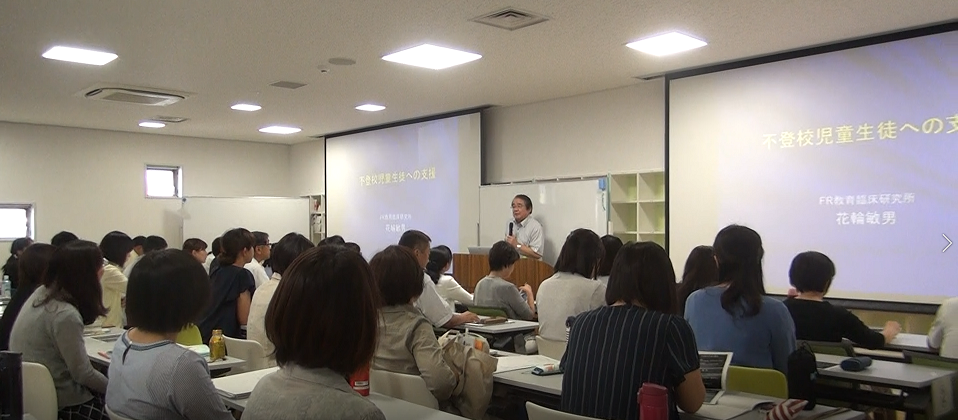 午後の講義・演習「教育相談・生徒指導を生かした児童生徒理解」では、山形県天童市からFR教育臨床研究所の花輪敏男先生をお迎えして、不登校児童・生徒への対応について研修しました。不登校児童・生徒やその保護者と真正面から向き合ってきた花輪先生の実践に基づいた、「学校復帰」への導き方について学びました。児童・生徒と関わるうえでは困難なことも多かったことでしょうが、花輪先生のユーモアたっぷりの語り口に、参加者は自然に笑顔になり、共感と納得でうなずく場面がたくさんありました。研修を終えて「不登校生への対応でずっと悩んでいたが、光が見えた気がする。」「スモールステップの技術をこれから生かしたい」「本人が意志決定する機会や本人の気持ちを尊重する場面を教師が意図的に作ってあげることが大切だと思った」との感想があげられました。