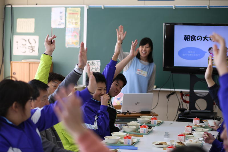 今日、朝食を食べてきた人?!という栄養教諭からの質問に対して、生徒も職員も全員手を挙げました。
