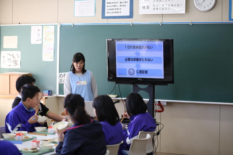 2019年11月5日 13時21分本日の給食の時間に、栄養教諭が指導に来てくれました。本日の話は、生徒達の人生に大きく関係する大切な話しでした。