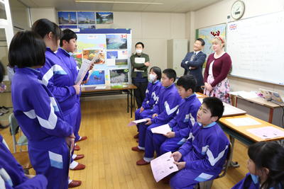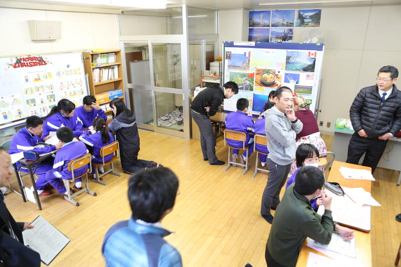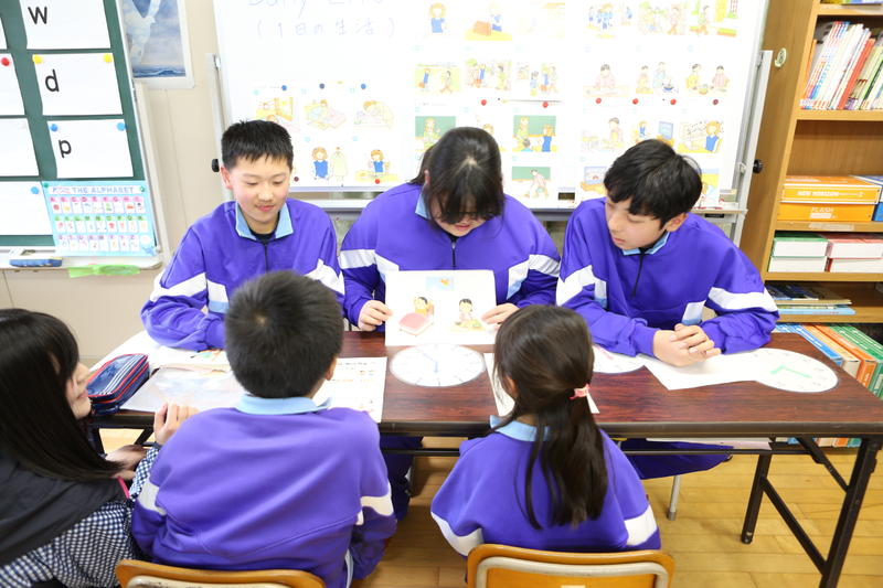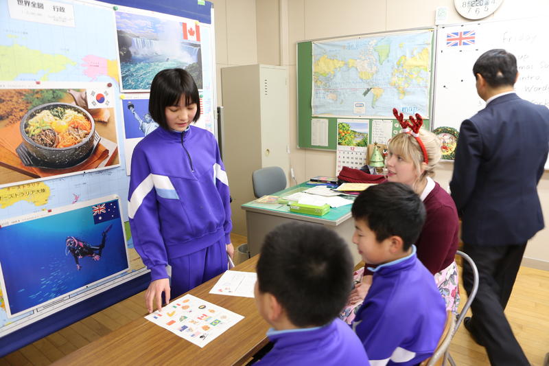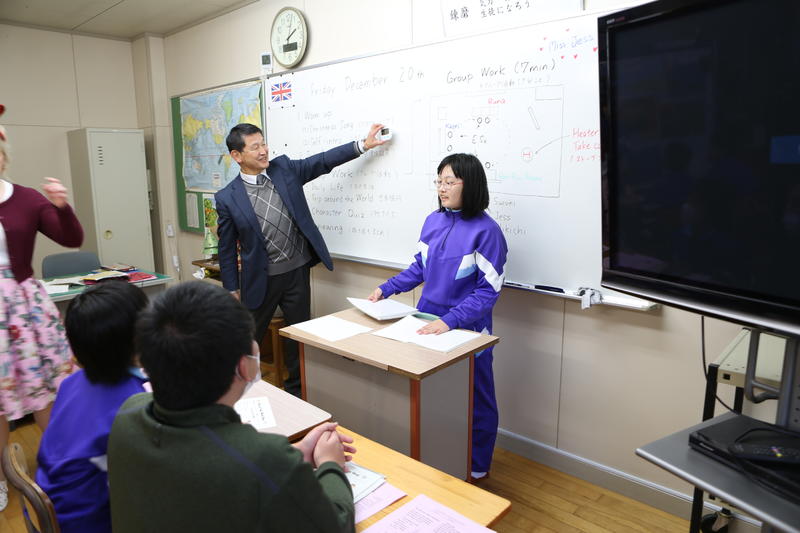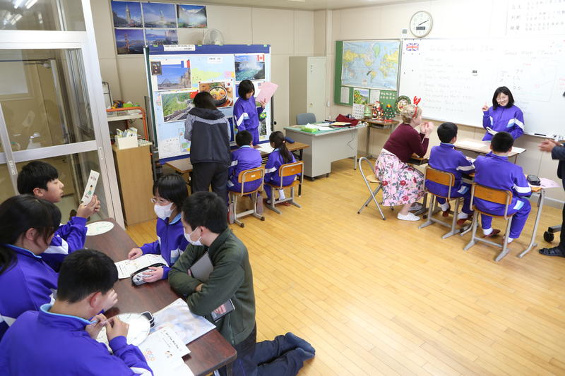 後半は、中学生のいるテーブルに小学生が廻り、中学生からの質問に答えたり、中学生が英語を教えたりしました。