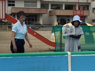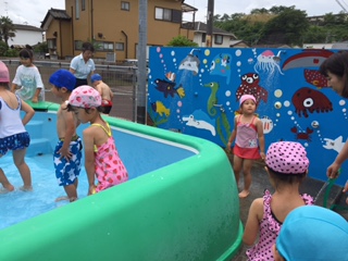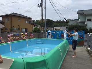 まずは、園長先生と、あけみ先生が、ケガや事故が無いように、プール遊びのお約束を教えてくれました。