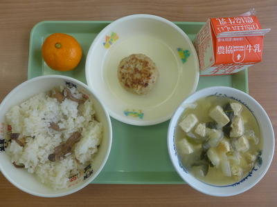2019年12月9日 11時55分今日の給食は、たきこみきのこごはん・いりどうふつつみやき・玉ねぎのみそ汁・みかんです。