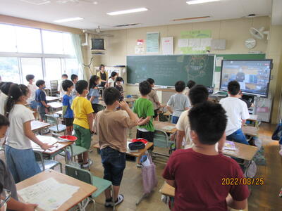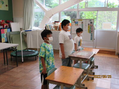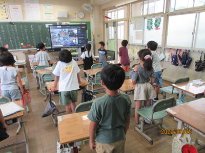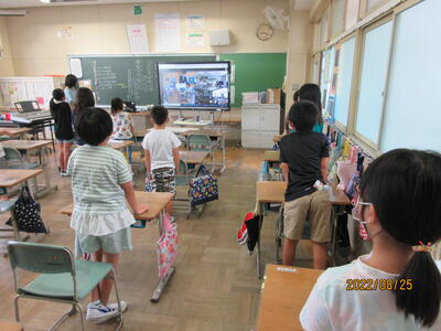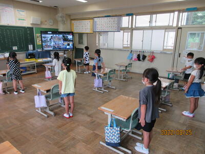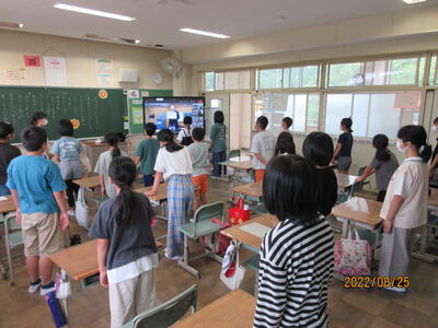 2022年8月25日 14時37分 令和4年8月25日(木)、事故やけが無く、第2学期の始業式を迎えることができました。これも保護者の皆様のご協力があってのことと感謝いたします。市内では、新型コロナウイルスの感染が高止まりしていますが、全校児童、教職員で力を合わせ、感染防止に努めて参ります。そのため、本日の始業式は、リモートで実施しました。