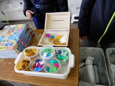 当番の児童が発表の数だけ「コイン」や「ダイヤ」を宝箱に入れていました。