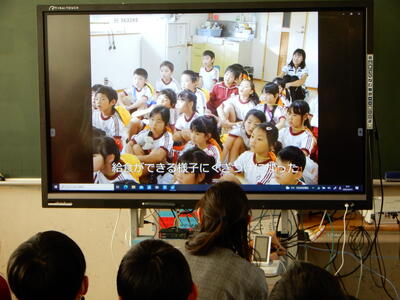 6年生の教室は大盛り上がりでした。映像後には、5年生からメッセージカードが届けられました。