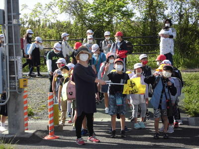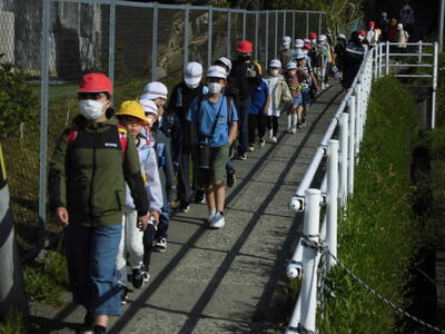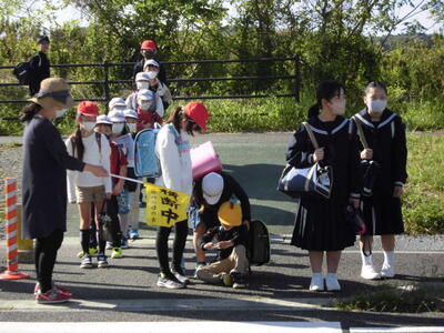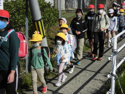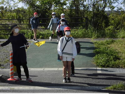 集団登校です。遠い班は3㎞以上の道のりを登校してきます。