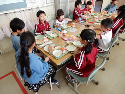 1年生は園児に対して学校生活について紹介していました。また、一緒にゲームをしたり給食を食べたりして、楽しく過ごしました。