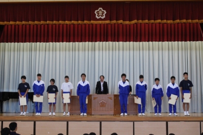 激励会に先立ちまして先日行われた市中体連陸上大会の表彰も行われました。