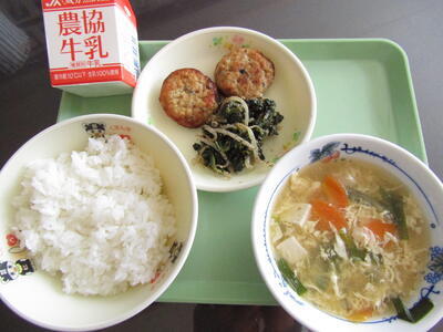 ごはん、牛乳、鶏つくね②、ほうれん草のごま和え、にら玉汁