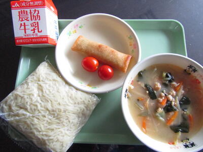 中華ソフトめん、味噌味スープ、牛乳、野菜春巻き、ミニトマト②