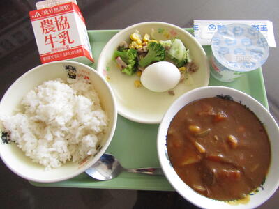 福島まるごとカレーライス、牛乳、ゆで卵、ベーコンとブロッコリーのソテー、ヨーグルト