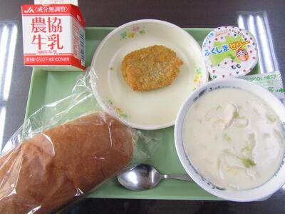 コッペパン、牛乳、かぼちゃコロッケ、白菜のクリームシチュー、桃ゼリー