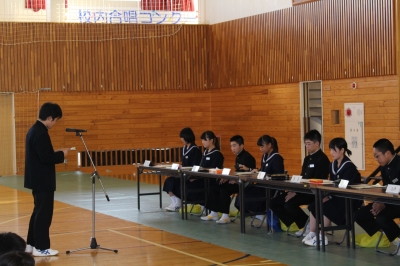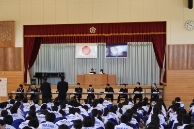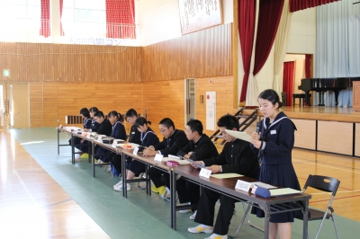 2015年10月9日 17時34分 10月9日(金)、生徒会総会が開催されました。生徒会本部と各委員会から後期活動方針及び月別活動計画が発表された後に各クラスから積極的な質問があり、磐崎中をよくしていこうという気持ちが見られる会となりました。また、総会前に、各種大会等の表彰と後期生徒会役員等の任命式が行われました。