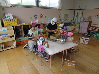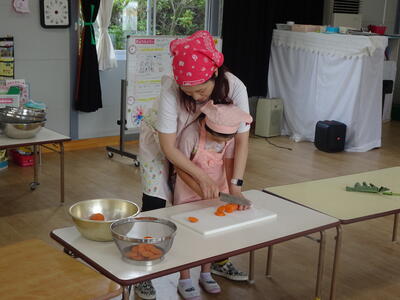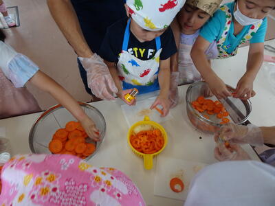 じゃがいもは園で収穫したものを、ズッキーニ、ピーマン、ミニトマト、ブロッコリー、ナスはわかば組(年長)の子供たちが育てているものを使い、調理も子供たち自身でできる範囲内で行いました。安全面・衛生面は、教師と協力を依頼した3名の保護者で十分配慮しました。