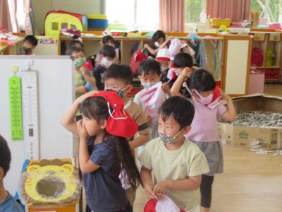 今日、第1回避難訓練を行いました。子ども達は、担任からの「おさない、かけない、しゃべらない、もどらない」の避難の約束の話に真剣に耳を傾けていました。 ひよこ組さんは今回は初めての訓練だったで、うめ組さん、わかば組さんの避難の様子を見学しました。次回からはひよこ組さんも実際に避難の訓練をします。