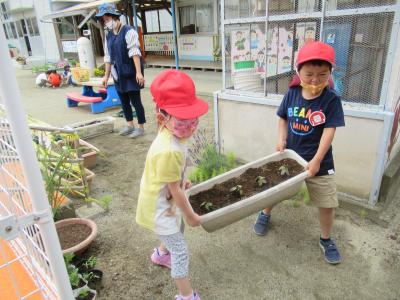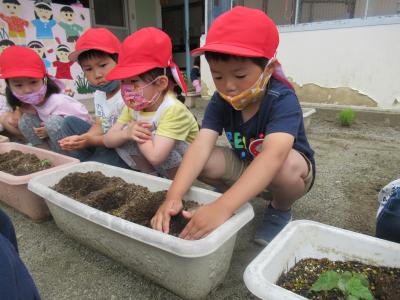 2021年6月2日 15時19分うめ組さん、アサガオの芽が大きくなってきたのでプランターへ引っ越しです。みんなでよく協力して植え替えを行えました。色とりどりにたくさんの花が咲くのが待ち遠しいです。