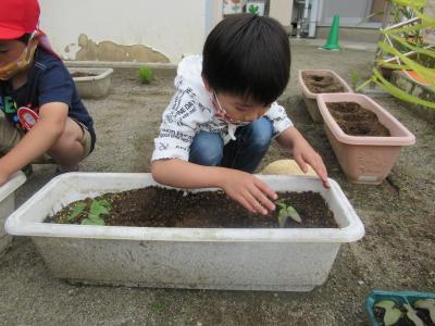 うめ組さん、アサガオの芽が大きくなってきたのでプランターへ引っ越しです。みんなでよく協力して植え替えを行えました。色とりどりにたくさんの花が咲くのが待ち遠しいです。