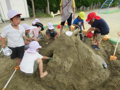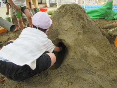 わかば組さん、昨日にひきつづき砂場で大山づくりです。今日はトンネルを掘ってみました。すると山が崩れてしまったので、みんなで知恵を出し合いプラスチックの菅を入れて補強をして作り直していました。挑戦→失敗→考察→再挑戦と、子ども達の追求は続きます。