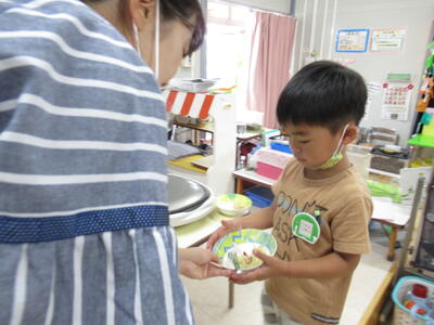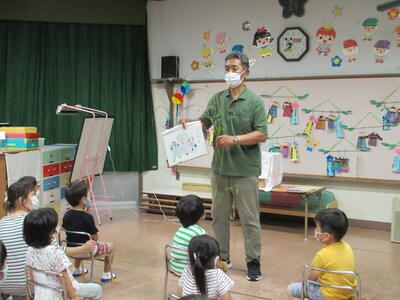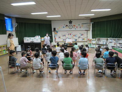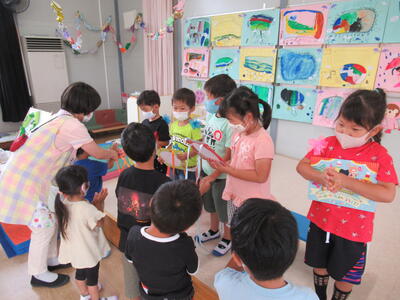友達の代表が一人ひとりに誕生日のプレゼントを渡しました。白土は「ヘビくんどうなったとおもう?」の絵本を読みました。教務主任は「見えるかな?不思議シアター」を行いました。