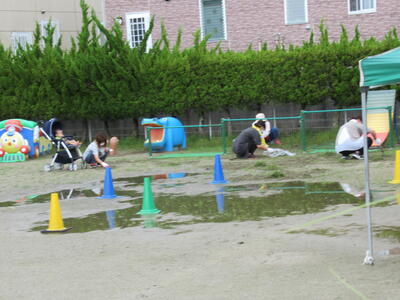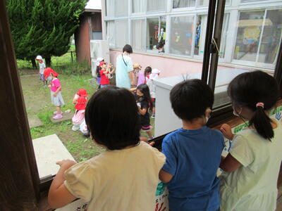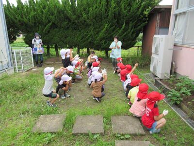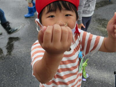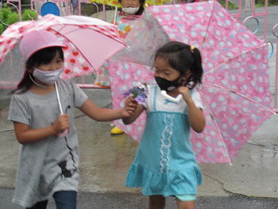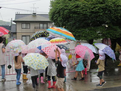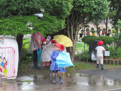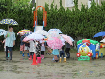 わかば組さんとうめ組さんは、園の敷地内で「雨の日の散歩」をしました。