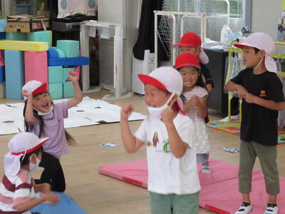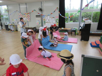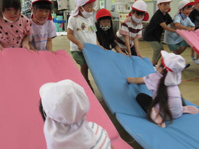 わかば組さんは「マット引っ張りレース」で白熱していました。