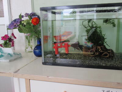 先生たちが掃除をし水を入れ替えた水槽の周りに、早速子ども達が集まってきて、「金魚さんたち、気持ち良さそう」「先生、きれいにしてくれてありがとう」など、感想や感謝の言葉を言ってくれました。自分たちでも虫やメダカをクラスで飼っているので、子ども達は生き物の命を大事に思っています。