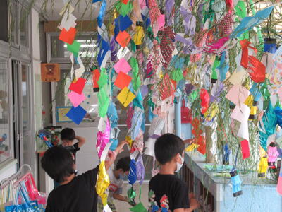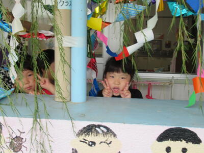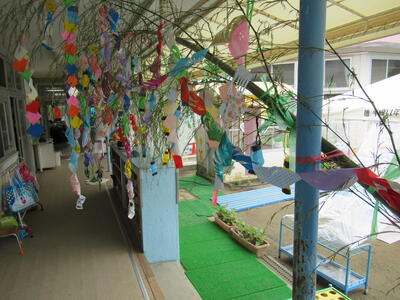 七夕会に向けって、両担任と白土で能満寺に行って竹をもらってきました。(7/5)早速子ども達が作った笹飾りをつけました。(7/6)
