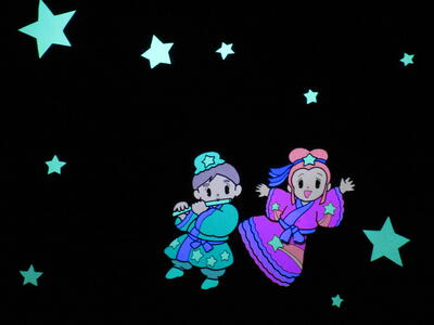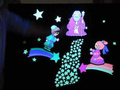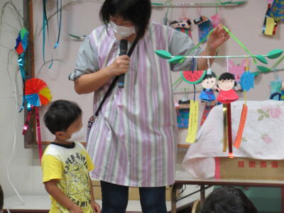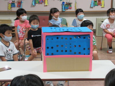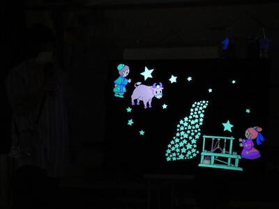 続いて、ひよこ・うめ組担任が七夕の由来となる織姫と彦星のお話をブラックパネルシアターで演じました。