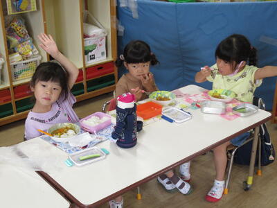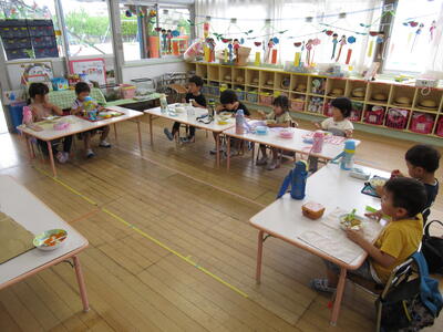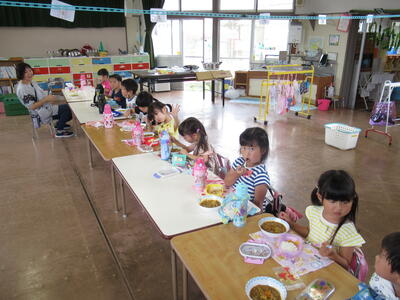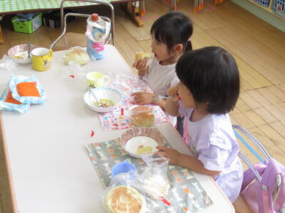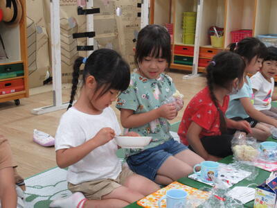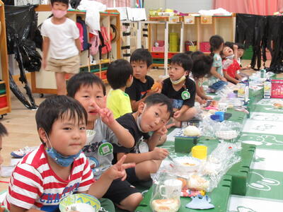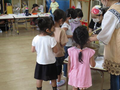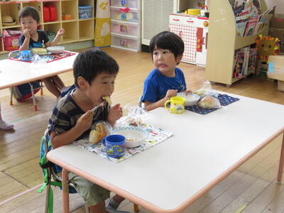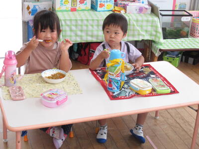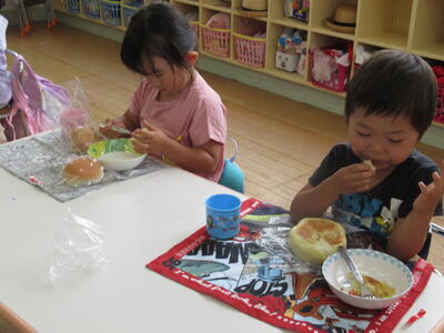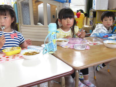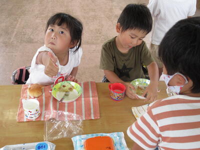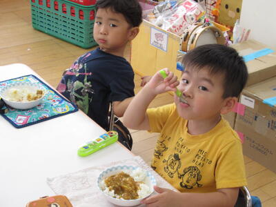 ひよこ組さん。「おいしい!」みんなおかわりをしました。