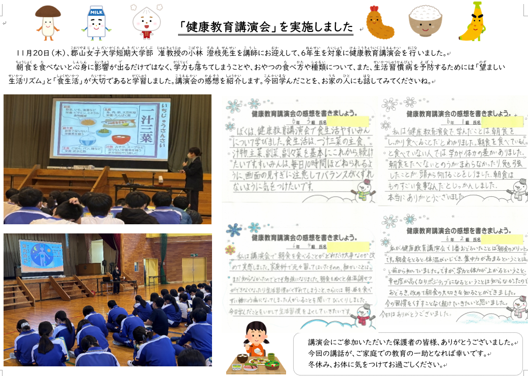 子供たちの運動能力、身長、体重、視力検査、歯科検査などの各種検査結果を分析して、そこから見える本校児童の健康課題をどのように学校として解決を図っていくかを考える機会としました。