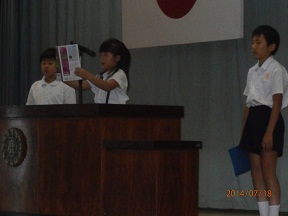 2014年7月18日 11時44分 1学期最後の日です。各学年しっかりした態度で終業式に臨みました。代表の2,4,6年生の子が、1学期を振り返っての作文を発表しました。また全校生で、大きな声で校歌を歌いました。明日からの長い夏休み、交通事故などにあわないよう十分気をつけて元気に生活して欲しいと思います。2学期の始業式には、また元気な笑顔に会えることを楽しみにしています。