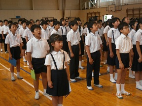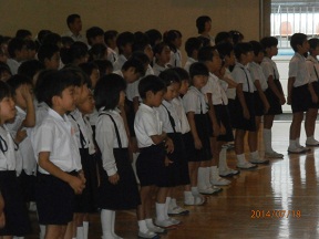 1学期最後の日です。各学年しっかりした態度で終業式に臨みました。代表の2,4,6年生の子が、1学期を振り返っての作文を発表しました。また全校生で、大きな声で校歌を歌いました。明日からの長い夏休み、交通事故などにあわないよう十分気をつけて元気に生活して欲しいと思います。2学期の始業式には、また元気な笑顔に会えることを楽しみにしています。