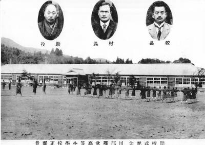 次の写真は、昭和3年(1928年)に校舎を増築し、「川部村立川部尋常高等小学校」が開校したときの写真です。この頃は、南向きの東西に長い校舎が2棟並んでいました。