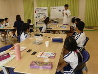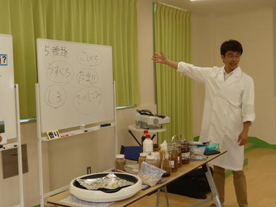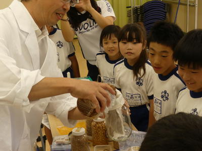 前半、しょうゆ博士から、しょうゆの原料やしょうゆの作り方について、本物の大豆や小麦、塩、麹菌、酵母菌などを実際に手にとって見せていただきながら学習しました。