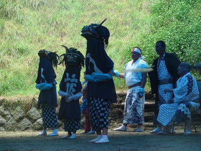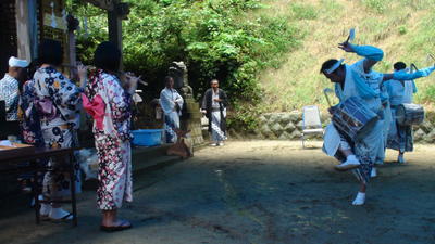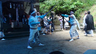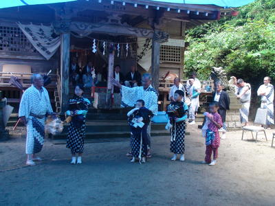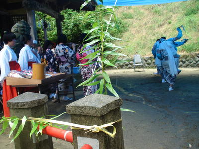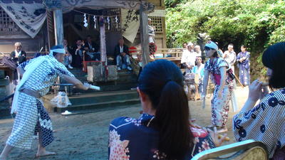 この日は朝からあいにくの雨模様でしたが、境内にブルーシートで屋根をかけて奉納の舞が行われました。