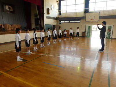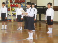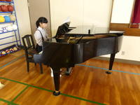 6年生の励ましの言葉を受けて、3曲を発表しました。「校歌」と「ゆかいに歩けば」は子どもが伴奏をします。
