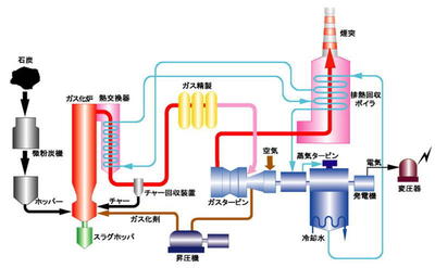 石炭をガス化させ石炭ガスでタービンを回し、そのガスの熱で更にボイラーから蒸気を出してタービンを回す。使用する石炭を2割減らせるので、二酸化炭素の排出を減らせる。