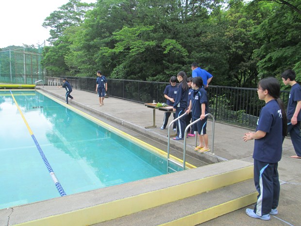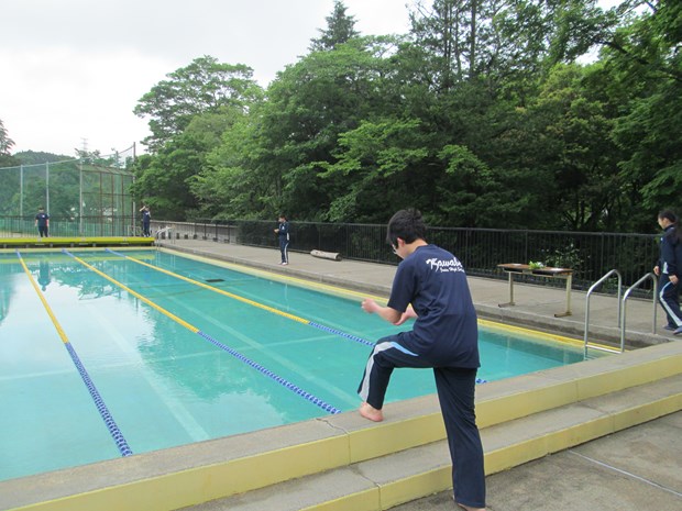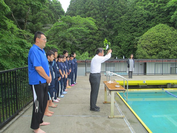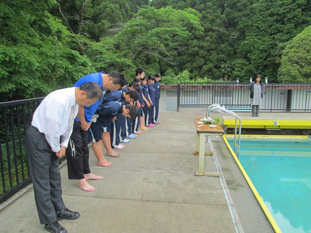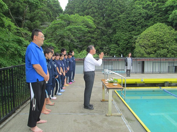 本日、プール開きを行い、プールでの事故の絶無と生徒の活躍を願いました。榊、塩、天然水も用意し厳粛に行いました。頑張れ水泳部!