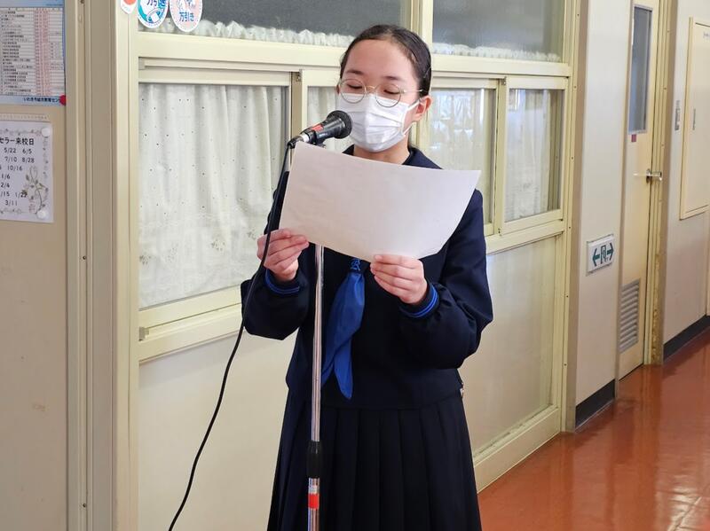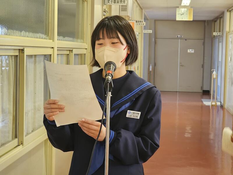 第2学期終業式 2023年12月25日 13時28分 第2学期終業式、代表生徒の立派な2学期の反省で今年のよい締めくくりができました。皆様方、どうぞよいお年をお迎えください。来年もよろしくお願いいたします。